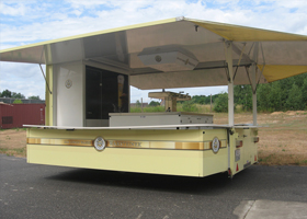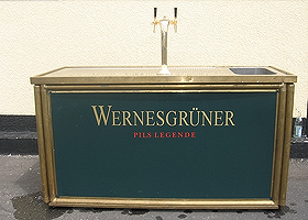 Warsteiner Verkaufsanhänger Höhe 2,66 m, Breite 2,26 m, Länge 4,38 m Stellfläche ausgeklappt: 19,97 m² Länge der Klappen: 1,58 m Bierzapfhähne: 4 Stück Premixanlage: nein Kühlezelle: ja(Höhe 1,89m/ Breite 0,84m) Deichsel: 2,10 m Besonderheit: Kühlschrank unter der Theke |
