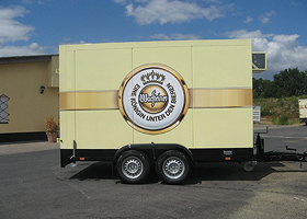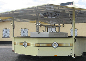 Warsteiner Verkaufsanhänger Höhe 2,57 m, Breite 2,40 m, Länge 4,00 m Stellfläche ausgeklappt: Länge der Klappen: 1,73 m Bierzapfhähne: 4 Stück Premixanlage: nein, Kühlezelle: nein Deichsel: 1,90 m |